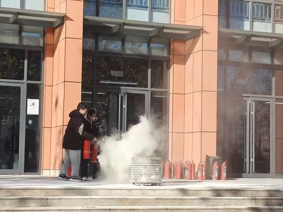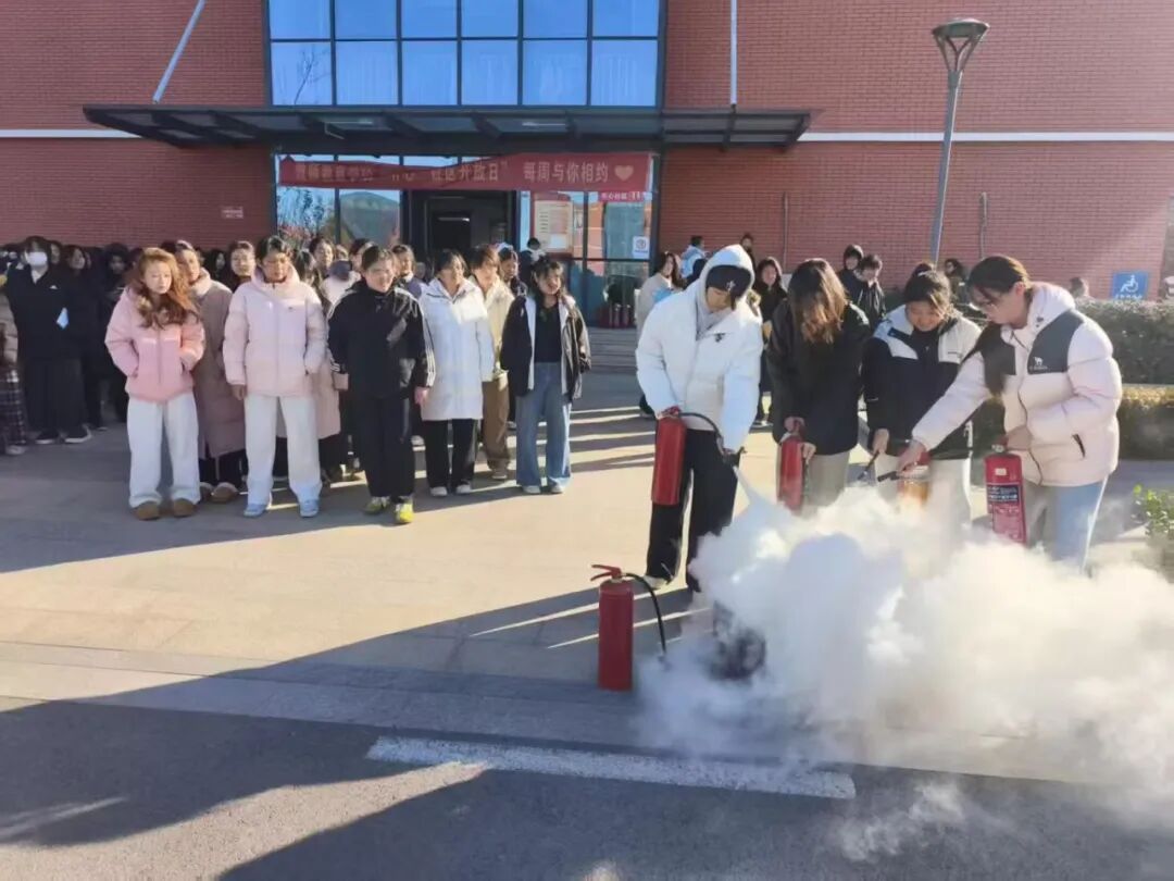 疏散环节后,演练进入实战指导阶段。学院副院长杨雪梅深入宿舍区,现场强调宿舍安全规范与实操要点;与此同时,崔越涯老师在教学楼前为同学们详细讲解了灭火器的原理、适用场景,并重点演示了“提、拔、握、压”的操作要领。在学生代表实操环节,老师们逐一指导纠正,确保大家熟练掌握灭火技巧,成效显著。